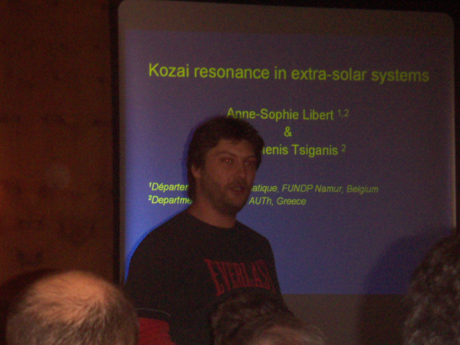 Auch am Nachmittag ging es hauptsächlich um die Trojaner. Zuerst hielt Kleomenis Tsiganis (Universität Thessaloniki, Griechenland) aber noch einen Vortrag über extrasolare Planeten: „Kozai resonance in extra-solar systems“ (Kozai-Resonanzen in extrasolaren Planetensystemen). Anders als die Resonanzen der mittlerern Bewegung, über die ich gestern schon was geschrieben habe, ist eine Kozai-Resonanz durch eine gekoppelte Änderung von Exzentrizität und Bahnneigung einer Planetenbahn gekennzeichnet. Wird die Exzentrizität einer Bahn größer, wird gleichzeitig ihre Neigung kleiner und umgekehrt. Kleomenis hat nun untersucht, ob dieser Art von Resonanz, die wir bisher nur von Asteroiden in unserem Sonnensystem kennen auch bei extrasolaren Planeten auftreten kann. Er fand, dass dies zumindest bei zumindest 2 der bisher bekannten Systemen so sein könnte. Allerdings tritt diese Resonanz nur dann auf, wenn ein Planet schon von Haus aus eine sehr hohe Bahnneigung hat. Und nach dem gestrigen Vortrag von Elke Pilat-Lohinger wissen wir ja auch, dass sowas tatsächlich der Fall sein kann und unter Umständen dramatische Folgen für die Dynamik dieses Systems hat. Kleomenis hat deswegen auch mögliche Mechanismen untersucht, die einem Planeten eine so starke Bahnneigung geben könnten. Der einzige, der in diesem Fall in Frage kommt wäre die gravitative Interaktion mit einem weiteren Planeten in diesem System.