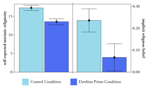 Links sieht man, wie die Probanden ihre Religiosität selbst einschätzen; rechts sind die Ergebnisse des objektiven Tests. Die Kontrollgruppe ist hellblau dargestellt; die Gruppe, die Dawkins gelesen hat ist dunkelblau. Die Unterschiede sind zwar nicht dramatisch groß, aber signifikant.