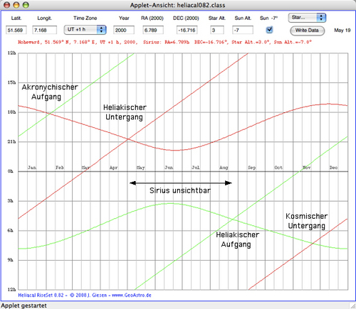 Hier gibt es übrigens ein nettes Applet, mit dem sich die akronychischen Auf- und Untergangszeiten für beliebige Objekte berechnen kann. So sieht das am Beispiel des Sirius aus: