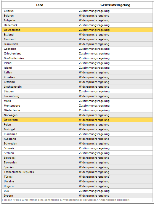 2. In diesem Fall, und auch im Fall eines Deutschen in Österreich, gilt das Teritorialrecht, also das jeweilige Landesrecht. In dem Fall, dass Du in Deutschland im Spital landest, würde Deine Familie mit der Frage konfrontiert werden und zustimmen oder verweigern müssen. Andersherum gilt es genauso, Deutsche, die in Österreich als mögliche Organspendern in Frage kommen, gelten automatisch als Spender, wenn sie nicht in irgendeiner Art – wie oben beschrieben – widersprochen haben.