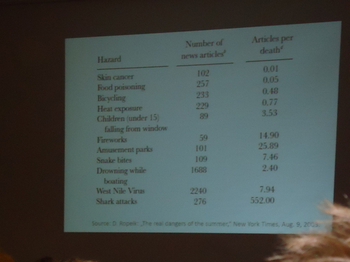 Krämer hat in seinem Vortrag viele Beispiele dafür gebracht. Wir fürchten uns vor dem Rinderwahnsinn, obwohl daran in Deutschland kaum jemand gestorben ist. Wir haben allerdings kein Problem damit, Fisch zu essen – obwohl jährlich in Deutschland über 500 Menschen an Fischgräten ersticken. Dank Hollywood haben wir Angst vor Haien, obwohl sehr wenig Menschen tatsächlich von Haien angegriffen und getötet werden. Wir haben Angst vor den Pestiziden in der Nahrung aber die überwiegende Mehrheit der natürlichen Giftstoffe in den Lebensmitteln lässt uns kalt. In Flugzeugen sterben weniger Menschen als im Strassenverkehr und trotzdem haben wir mehr Angst davor in ein Flugzeug zu steigen als in ein Auto. Beispiele dieser Art gibt es haufenweise und sie zeigen uns, dass wir es oft schwer finden, Risiken richtig einzuschätzen.