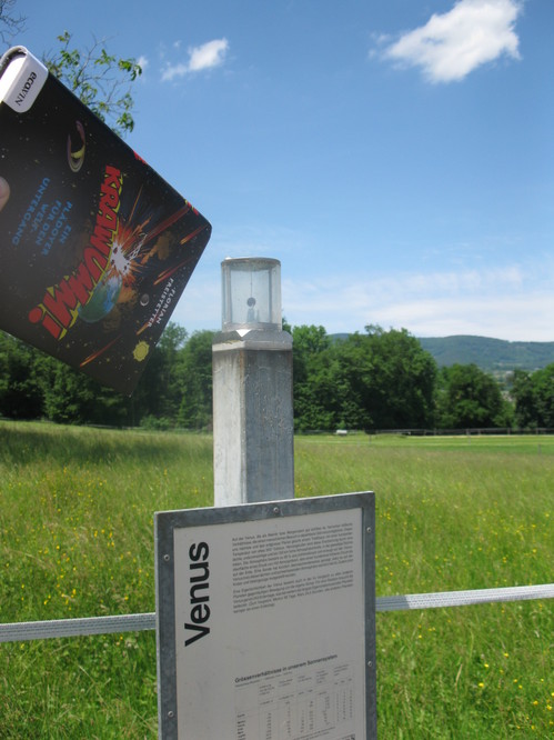 Ein besonders schönes Foto für meine Serie „Ein Krawumm geht um die Welt“ habe ich aus der Schweiz bekommen. Es stammt von Leser „noch ’n Flo“ und wurde am Planetenweg Laufen aufgenommen. Der bildet das Sonnensystem im Maßstab 1:1 Milliarde ab und beinhaltet natürlich auch die Venus. Die schiebt sich am Mittwoch vor die Sonne und passend zu diesem Jahrhundertereignis schiebt sich auch mein Buch vor die Venus: