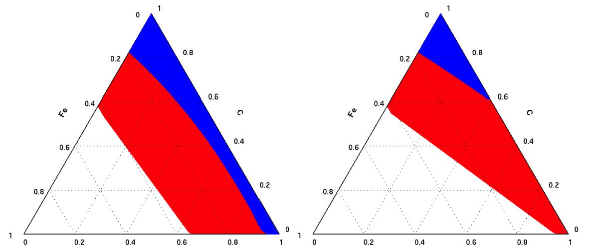 Man liest es so: Die drei Seiten des Dreiecks geben die Anteile des jeweiligen Materials wieder. Nehmen wir an, der Planet würde zu 60 Prozent aus Eisen, zu 20 Prozent aus SiC und zu 20 Prozent aus Kohlenstoff bestehen. Dann muss er sich an einem Punkt im Diagramm befinden, von dem aus man entlang einer der Linien zum Wert „0,6“ auf der Eisenseite des Dreiecks gelangt, zum Wert „0,2“ auf der SiC-Seite und zum Wert „0,2“ auf der Kohlenstoffseite. So einen Punkt gibt es und wenn wir nachsehen, dann sehen wir, dass er in der linke Ecke des Dreiecks im weißen Bereich liegt. Weiß bedeutet in diesem Fall aber, dass die Modelle diese Zusammensetzung nicht erlauben. Diese Zusammensetzung kommt für 55 Cancri e also nicht in Frage! Nur die roten und blauen (entspricht wieder den beiden Messungen, wobei der rote Bereich den blauen Bereich beinhaltet) Bereiche stellen erlaubte Kombinationen dar. Jeder Punkt innerhalb der farbigen Bereiche von dem aus man Punkte an den drei Seiten des Dreiecks erreichen kann, deren Werte sich „1“ summieren, entspricht einer möglichen Zusammensetzung des Planeten. Er kann zum Beispiel aus 20 Prozent Eisen, 40 Prozent MgSiO3 und 40 Prozent Kohlenstoff bestehen (rechtes Dreieck, im roten Bereich). Oder aus 40 Prozent Eisen und 60 Prozent Kohlenstoff (linkes Dreieck, blauer Bereich). Und so weiter.