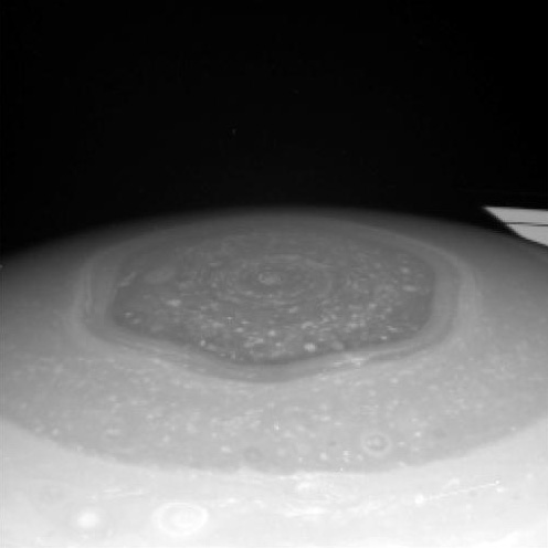 Dieser Sturm wurde das erste Mal 1980 aufgenommen, als die Voyager-Sonden am Saturn vorbei geflogen sind. Besonders interessant ist die Form des Sturms. Er zeigt hexagonale Strukturen, die vermutlich auf stehende Wellen in der Saturnatmosphäre zurückzuführen sind.