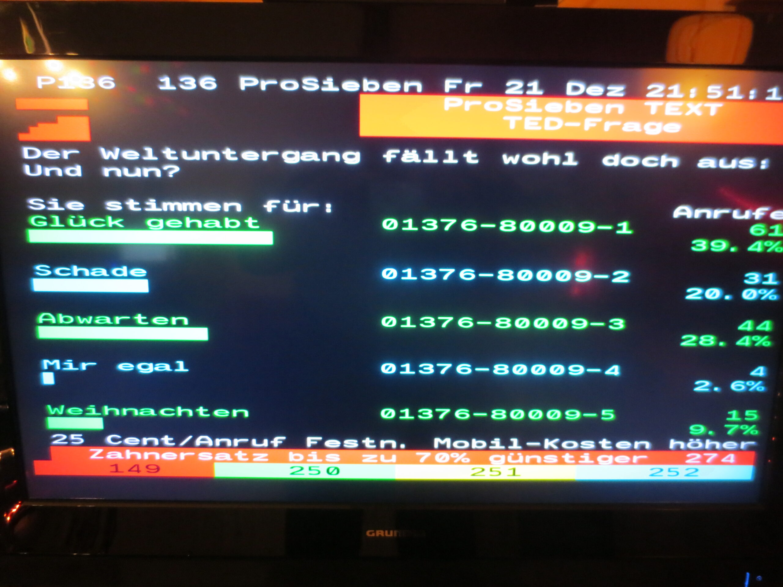 Noch ein bisschen Weltuntergangsabsurdität. Im Teletext (benutzt das heutzutage noch wer?) hab ich diese tolle Umfrage gefunden: