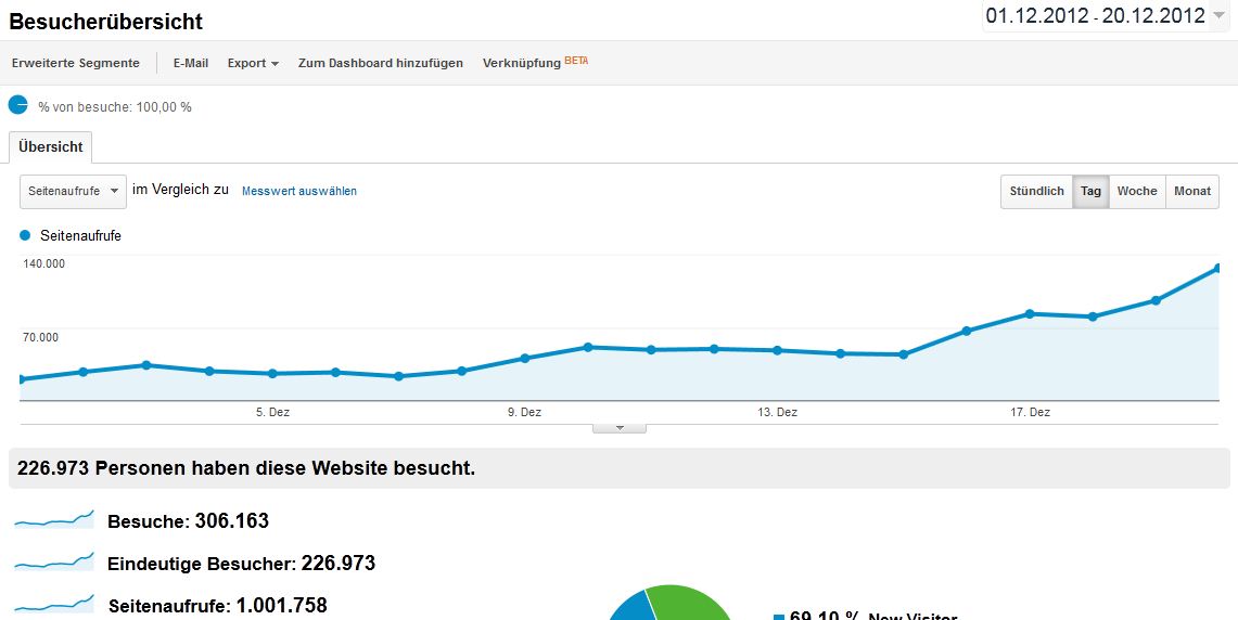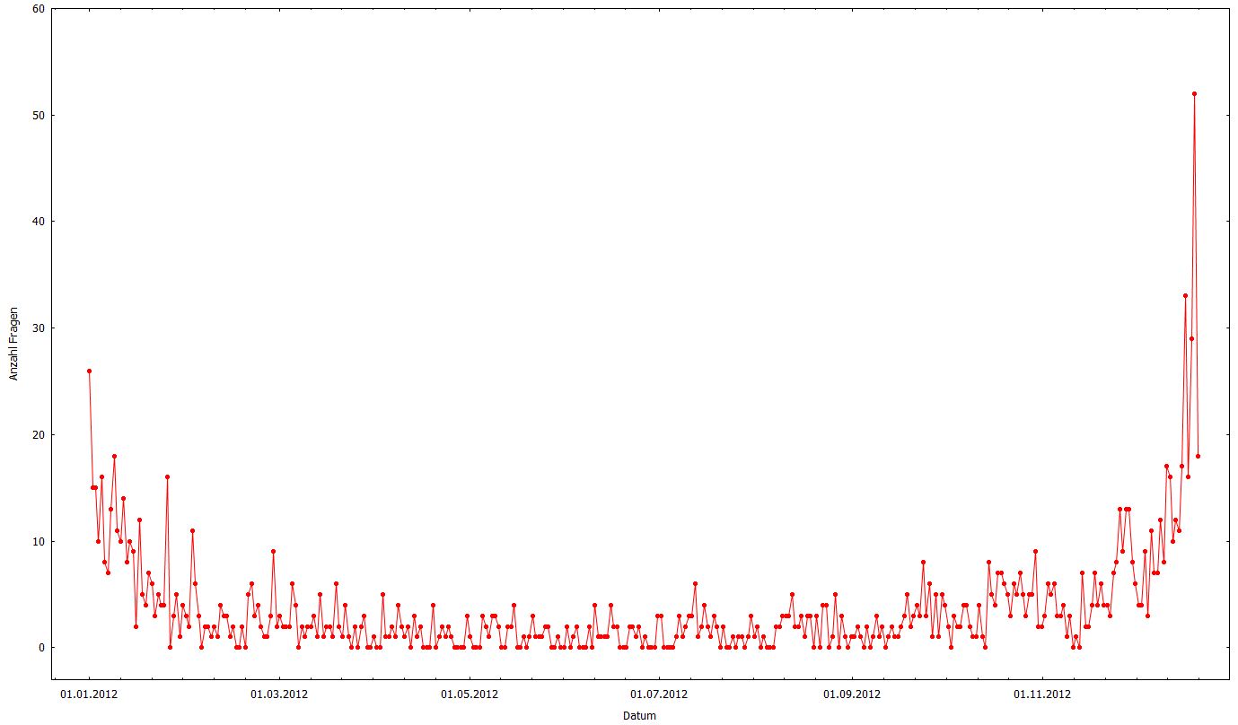 Es waren bis jetzt im Jahr 2012 genau 1270 Mails. Natürlich ist die Statistik unvollständig. Der heutige Tag ist noch nicht vorbei. Aber so wie es aussieht wird der gestrige Rekord von 52 Mails nicht mehr erreicht werden. Und natürlich fehlen all die Fragen, die mir direkt in den Kommentaren meiner diversen 2012-Artikel gestellt worden sind. Allein dieser Artikel hier enthält wahrscheinlich ein paar hundert Fragen. Ich weiß nichtmal, wie viele Kommentare meine 2012-Artikel insgesamt haben. Aber 10.000 ist vermutlich eine sehr konservative Schätzung. Und selbst wenn nur ein Drittel davon Fragen waren, sind das schon nochmal doppelt so viele.