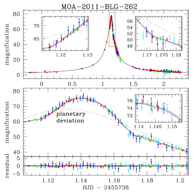 Die Veränderung der Helligkeit von MOA-2011-BLG-262. Das untere Bild vergrößert einen Ausschnitt der Kurve und zeigt einen kleinen zusätzlichen Helligkeitsanstieg (Bennett et al. 2013)