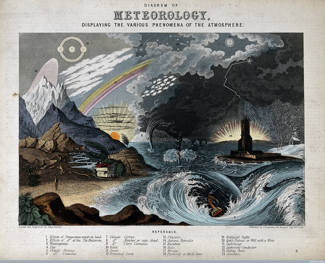 Wenn es draußen so bitter kalt ist, dann verkriecht man sich am besten mit einem schönen Buch in der hoffentlich warmen Wohnung. Im Blog von Joe Hanson bin ich passenderweise auf ein besonders schönes Exemplar gestoßen. Es trägt den beeindruckenden Titel „The Universal Atlas of Science. A Series of Four Hundred Coloured Maps and Diagrams, Illustrating Astronomy, Geology, Physical Geography, the Vegetable Kingdom, and Natural Philosophy; with Clear and Interesting Descriptions“ und stammt von einem gewissen James Reynolds über den ich leider nicht viel mehr herausfinden konnte. Es muss irgendwann in den 1850er Jahren erschienen sein und ist ein wirklich wunderbares Buch.