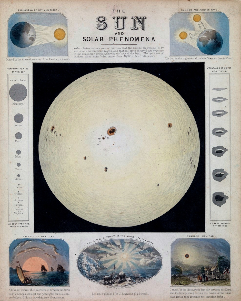 Es beginnt mit einem kurzen einleitenden Text, der sich mit der Sonne, der Erde und den Planeten des Sonnensystems beschäftigt. Damals war man ja schon auf einem guten Weg in der Astronomie. Man hatte schon Uranus und Neptun entdeckt und jede Menge Asteroiden. Man konnte die Wolkenbänder von Jupiter und die Ringe des Saturn im Teleskop beobachten. Friedrich Wilhelm Bessel hatte 1838 als erster Mensch den Abstand zwischen der Erde und einem anderen Stern gemessen und gezeigt wie enorm groß das Universum war. Charles Lyell hatte in den 1830er Jahren seine „Principles of Geology“ und die Menschen verstanden langsam, dass wie die Erde aufgebaut ist, funktioniert und dass sie sehr viel älter ist, als die Kirche behauptete. Von Lyell beeinflusst lernte Charles Darwin auf seiner Reise mit der HMS Beagle die ganze Welt kennen und entwickelte seine Theorie der Evolution die er 1859 publizierte. Es war eine enorm aktive und spannende Zeit in der Naturwissenschaft und die Forscher damals lernten enorm viel. Sehr viel verstanden sie aber noch nicht, was man auch im Einleitungstext von Reynolds‘ Buch merkt, wo darüber spekuliert wird, ob auf der Sonne Menschen leben (davon, dass die anderen Planeten des Sonnensystems bewohnt sind, war man im 18. und 19. Jahrhundert allgemein überzeugt). Man verstand zwar die Erde immer besser; von den Sternen hatte man aber noch kaum Ahnung. Man hielt die Sonne für einen Himmelskörper wie die Erde, der allerdings zusätzlich von einer leuchtenden Schicht aus Wolken umgeben war…