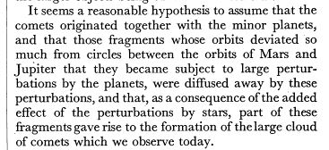 Er bevorzugt eine andere Hypothese. Die Kometen sollen gemeinsam mit den Asteroiden (oder den „Kleinplaneten“ bzw. „minor planets“, wie es damals noch hieß) entstanden sein und später durch die gravitativen Störungen der Planeten in die äußersten Bereiche des Sonnensystems transportiert worden sein: