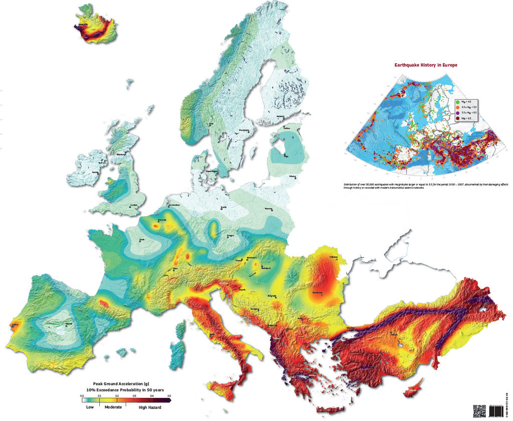 Es geht um die Arbeit des SHARE-Konsortiums. „SHARE“ steht dabei für Seismic Hazard Harmonization in Europe und unter der Leitung von Geophysikern aus der Schweiz hat man Erdbebendaten aus ganz Europa gesammelt und historische Daten aufbereitet. Bis jetzt hatten unterschiedliche Länder unterschiedliche Messverfahren und Modelle verwendet und die nationalen Daten konnten nicht immer gut miteinander verglichen werden. SHARE hat das jetzt alles vereinheitlicht und alle Daten mit einem einzigen Computermodell ausgewertet. So war es möglich, die geologischen Bewegungen in ganz Europa in einer großen Datenbank zusammenzufassen und am Ende die European Seismic Hazard Map 2013 zu veröffentlichen. Die berücksichtigt alle Erdbewegungen die in der Vergangenheit gemessen wurden und zeigt auf, wo die geologisch aktiven Zonen zu finden sind.
