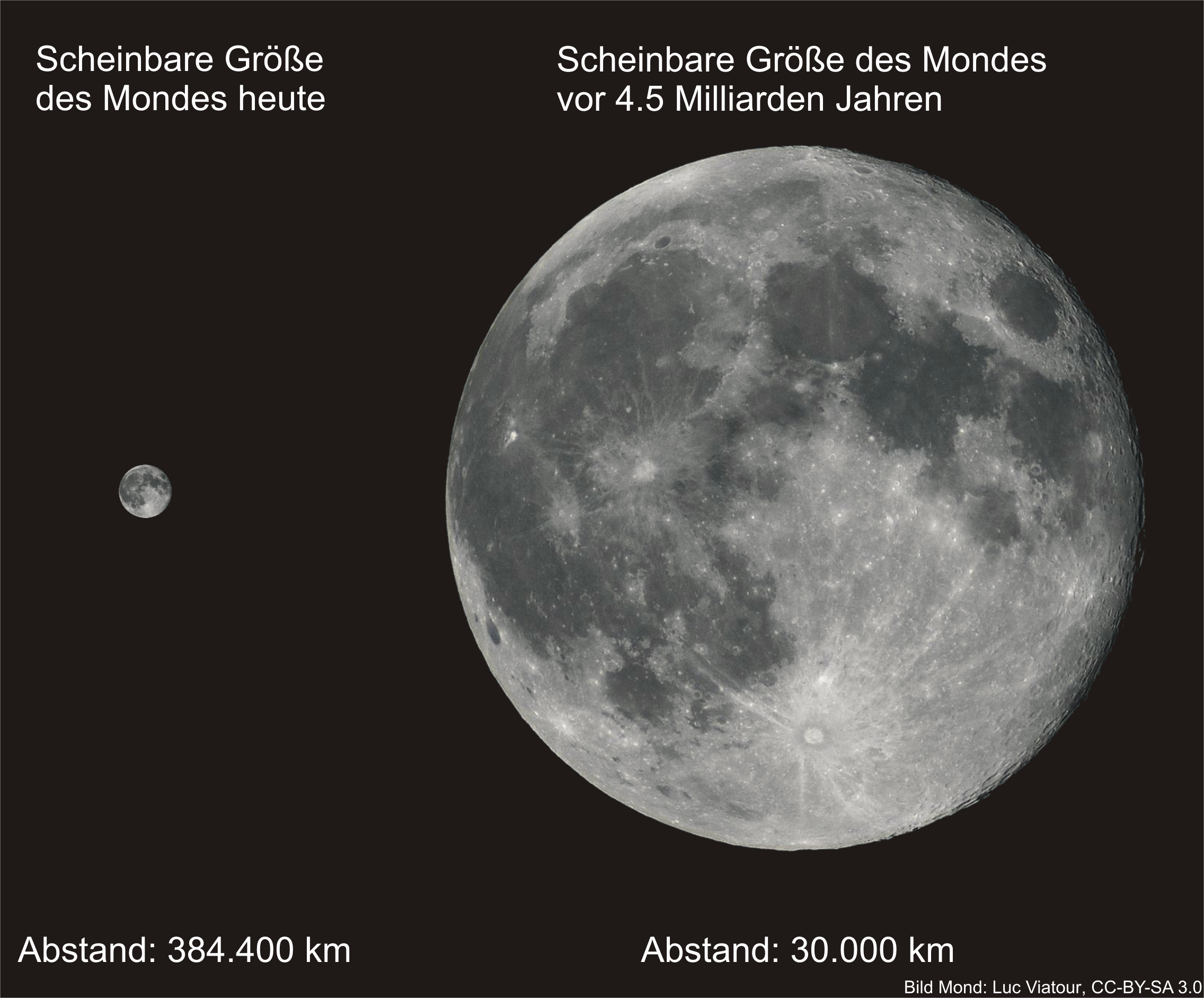Das ist also der Grund, warum der Mond von der Erde weg rückt und er tut das heute immer noch. Das weiß man, weil man den Abstand zum Mond wirklich genau messen kann. Seit die ersten Apollo-Astronauten auf dem Mond im Jahr 1969 gelandet und dort wissenschaftliche Instrumente aufgestellt haben, kann man mit Laserstrahlen von der Erde aus den Abstand millimetergenau messen und weiß, dass er sich jedes Jahr um knapp 3,8 Zentimeter entfernt.