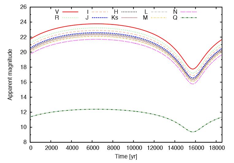 Die verschiedenen Kurven geben die Helligkeit in verschiedenen Wellenlängen an. Die rote mit „V“ markierte Linie gibt die visuelle Helligkeit an, also die, die wir theoretisch auch mit freiem Auge sehen können. In dem Fall aber nicht, da „Planet 9“ höchstens die 18 Größenklasse erreicht. Das ist weit jenseits dessen, was unsere Augen können und auch weit jenseits der meisten Teleskope. Viel heller ist der Planet im „Q“, die dunkelgrüne Linie ganz unten. Das ist die Helligkeit im mittleren Infrarotbereich, als – vereinfacht gesagt – die Wärmestrahlung.