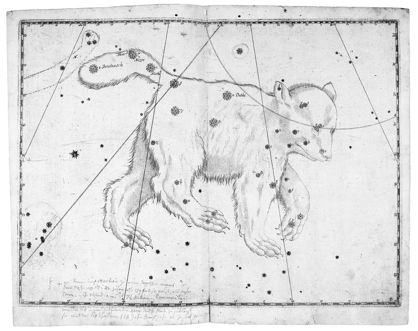 Alessandro Piccolomini, Toskana, “De le stelle fisse” 1552: z.B. Karte de L’ „Orsa Maggiore“ (großer Bär) (Holzschnitt, ca. 14 x 17 cm, Sternbild in direkter Himmelsansicht!, ein Maßstab u. Nordrichtung)