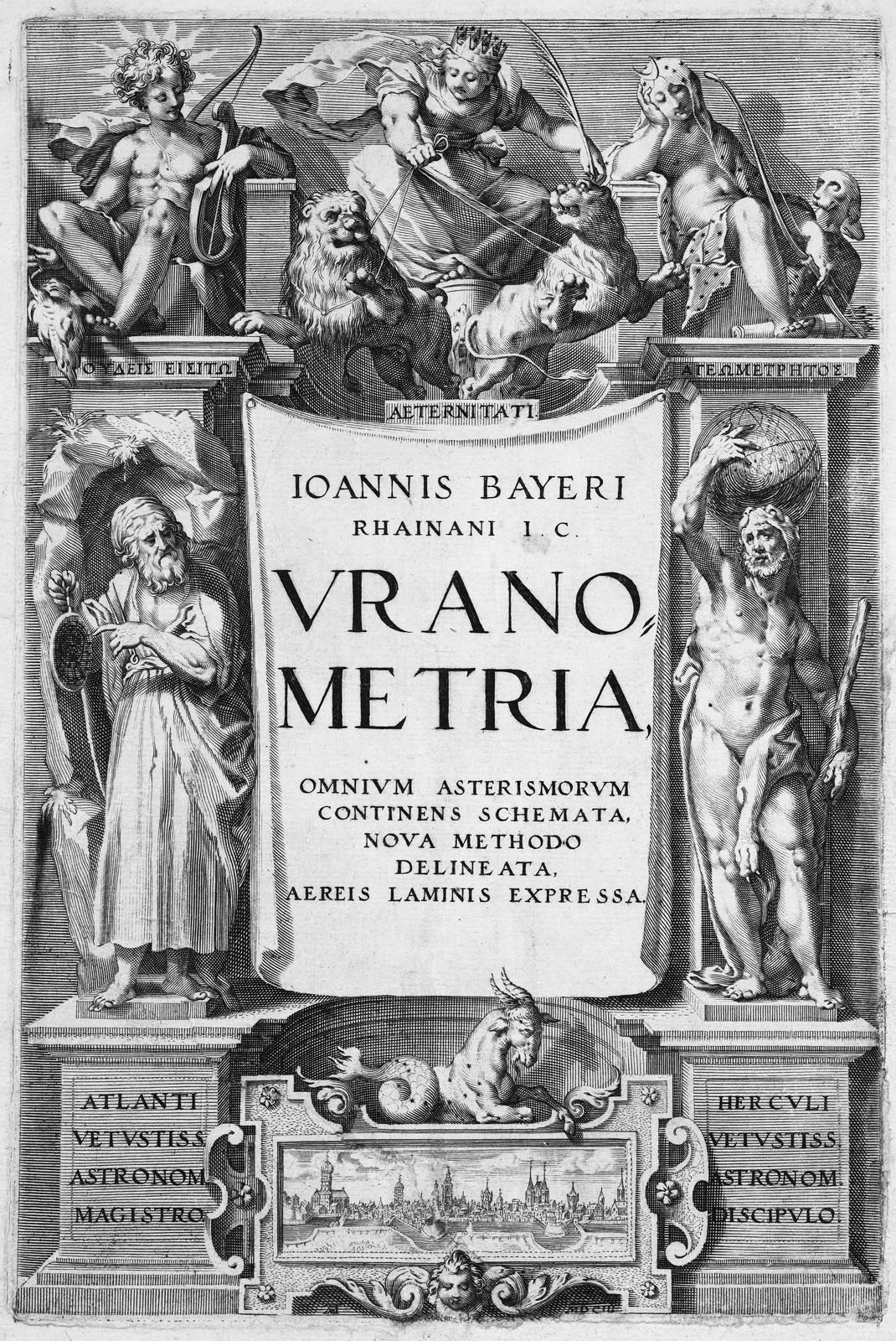 Vielleicht sogar im Auftrag des Magistrats der Stadt Augsburg schuf der in Augsburg lebende Rechtsanwalt Johann Bayer sein als Uranometria bezeichnetes Sternkartenwerk: Im September 1603 widmete der Augsburger Jurist Johann Bayer seinen großartigen Sternatlas „Uranometria“ den Stadpflegern und dem Rat der Stadt Augsburg. Er erhielt dafür eine „reiche Verehrung von 150 Gulden“ (so vermerkt in den Rechnungsbüchern der Stadt). Zu damaliger Zeit und Augsburger Verhältnissen entsprach diese „Verehrung“ etwa dem dreifachen Jahresgehalt eines Lehrers. Es gab, wie wir gerade sahen, schon früher einige Versuche, Karten der Sternbilder zu zeichnen, aber die Uranometria 1603 war der erste zuverlässige Sternatlas. Bayer benutzte neben dem Almagest des Ptolemäus den Sternkatalog des berühmten dänischen Astronomen Tycho Brahe (1546–1601), den dieser durch jahrelange präzise Beobachtung des Himmels zusammengestellt hatte. Einige Exemplare von Brahes Katalog zirkulierten in handschriftlicher Form schon vor dem Druck im Jahre 1602. Bayer lag solch ein handschriftliches Exemplar vor. Um 1570 weilte Brahe für einige Jahre in Augsburg, um die Aufstellung eines riesigen Quadranten mit 5,45m Kantenlänge zu beaufsichtigen. Der für den Bürgermeister Paul Hainzel und dessen Bruder Johann Babtist 1569/70 von Brahe geschaffene Quadrant war das größte bewegliche Messinstrument dieser Art der damaligen Welt. Ulugh Begs Quadrant in Samarkant allerdings war stationär und hatte einen Durchmesser von 40 Metern. Leider wurde Brahes Quadrant bereits 4 Jahre später durch einen Sturm zerstört. Ein Beleg für die Verwendung von Brahes Sternkatalog für die Uranometria könnte eines der vier Augsburger Exemplare sein, von denen eines die Abschrift oder das Original von Tycho Brahes Sternenkatalog als Anhang an das gedruckte Kartenwerk enthält.