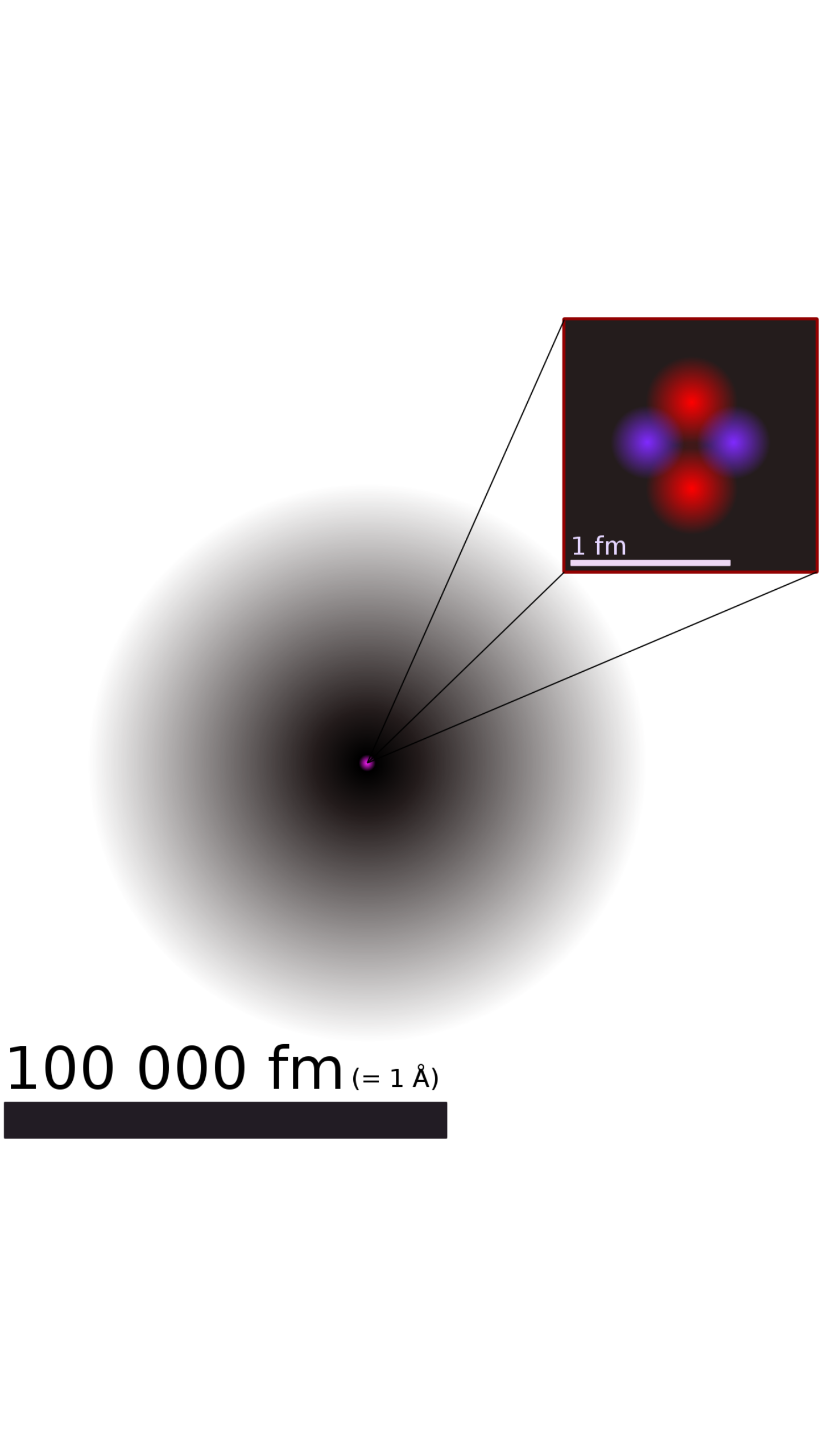 Im Gegensatz zu früher, als Atome als kleinste Teilchen und untrennbar galten (griech. átomos = unteilbar), wissen wir heute, dass sie aus einer Elektronenhülle und einem Atomkern bestehen. Dieser Kern besteht seinerseits noch einmal aus Protonen und Neutronen und ist im Vergleich zur Größe eines Atoms winzig klein, nämlich ca. 10^-14 m also 10 fm (= Femtometer, 1 fm = 1/1.000.000 nm), also 10000 mal kleiner. Im realisitischen Größenvergleich: Ein Tischtennisball auf dem Anstoßkreis inmitten der Münchener Allianzarena.