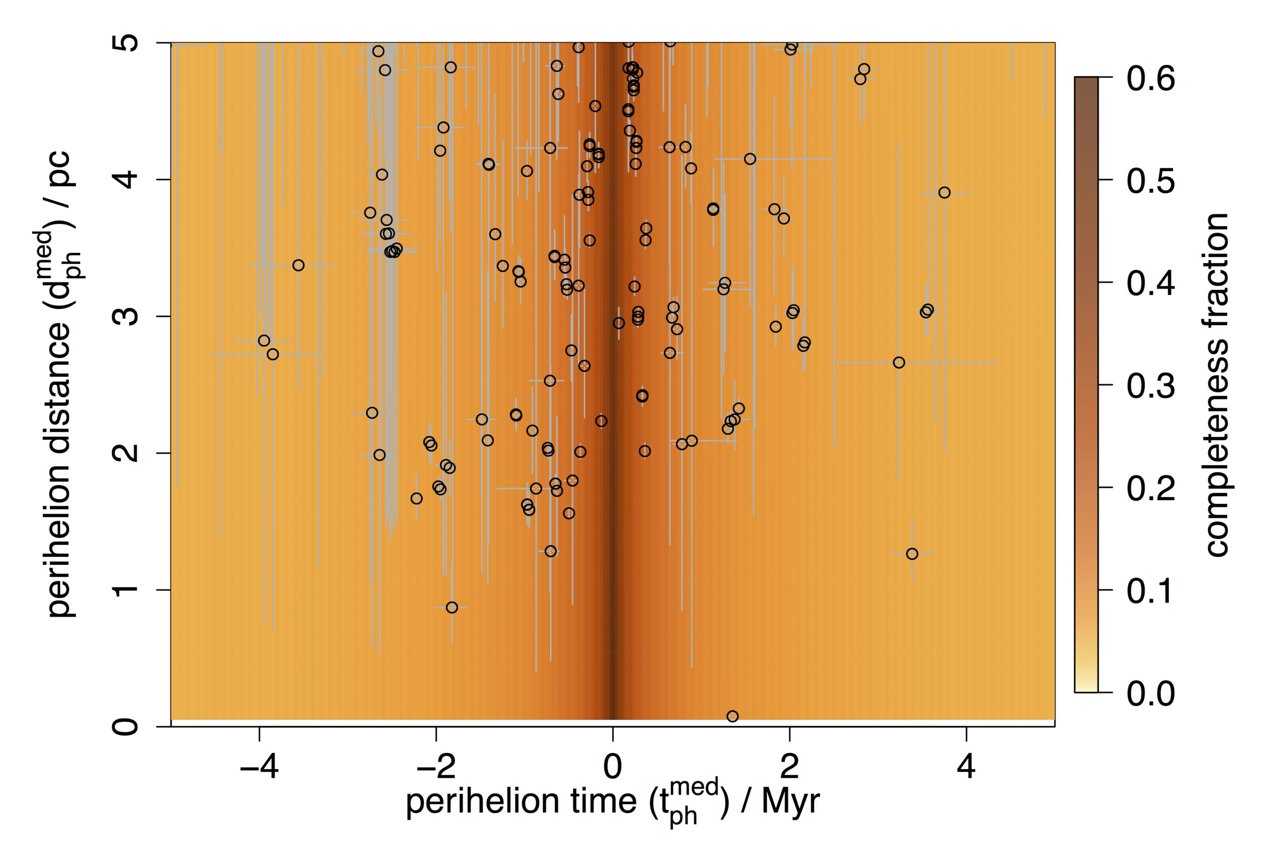 16 Stück sind es, die Bailer-Jones gefunden hat und die uns näher als 2 Parsec (das sind 6,5 Lichtjahre oder 413.000 Astronomische Einheiten) kommen. Natürlich sind in dieser Studie noch nicht alle Daten inkludiert und die selbst wenn der GAIA-Katalog vollständig ist, enthält er nur einen Bruchteil der Sterne unserer Milchstraße. Bailer-Jones hat daher aus den vorhandenen Daten und den bekannten Einschränkungen der Beobachtungsleistung des Teleskops hochgerechnet und fand eine durchschnittliche Begegnungsrate von 22 Sternen pro Million Jahre die der Sonne näher als 1 Parsec (bzw. 3,2 Lichtjahre oder 206.000 Astronomische Einheiten) kommen.