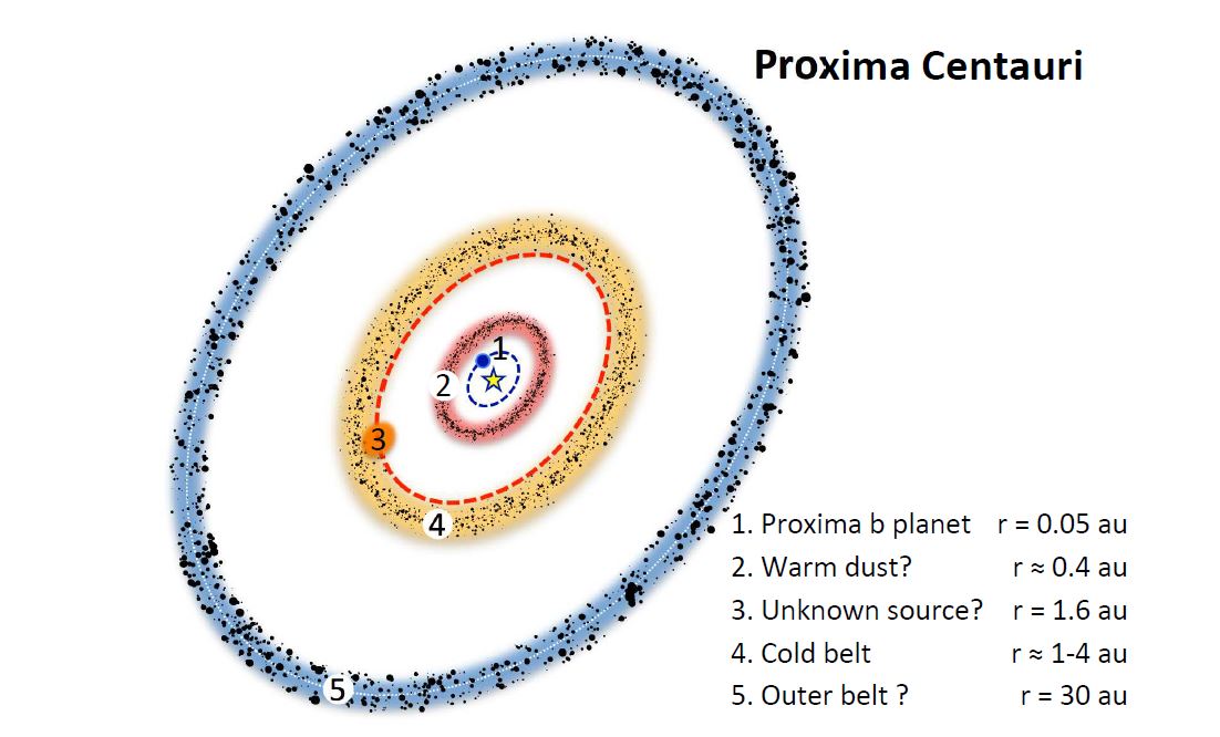 Zweifelsfrei nachgewiesen werden konnte ein Ring aus Staub der den Stern in etwa der ein- bis vierfachen Distanz umgibt in der die Erde unsere Sonne umkreist. Das entspricht der 20 bis 80fachen Distanz die der Planet Proxima Centauri b von seinem Stern hat. Man kann diesen Staubring also ungefähr mit dem Kuipergürtel des Sonnensystems vergleichen. Und so wie es in unserem Kuipergürtel ziemlich kalt ist und die Asteroiden dort extreme Eiswelten sind, ist es auch im Asteroidengürtel von Proxima recht frisch: Die Infrarotstrahlung die von ALMA beobachtet wurde weist auf Temperaturen von -230 Grad Celsius hin.