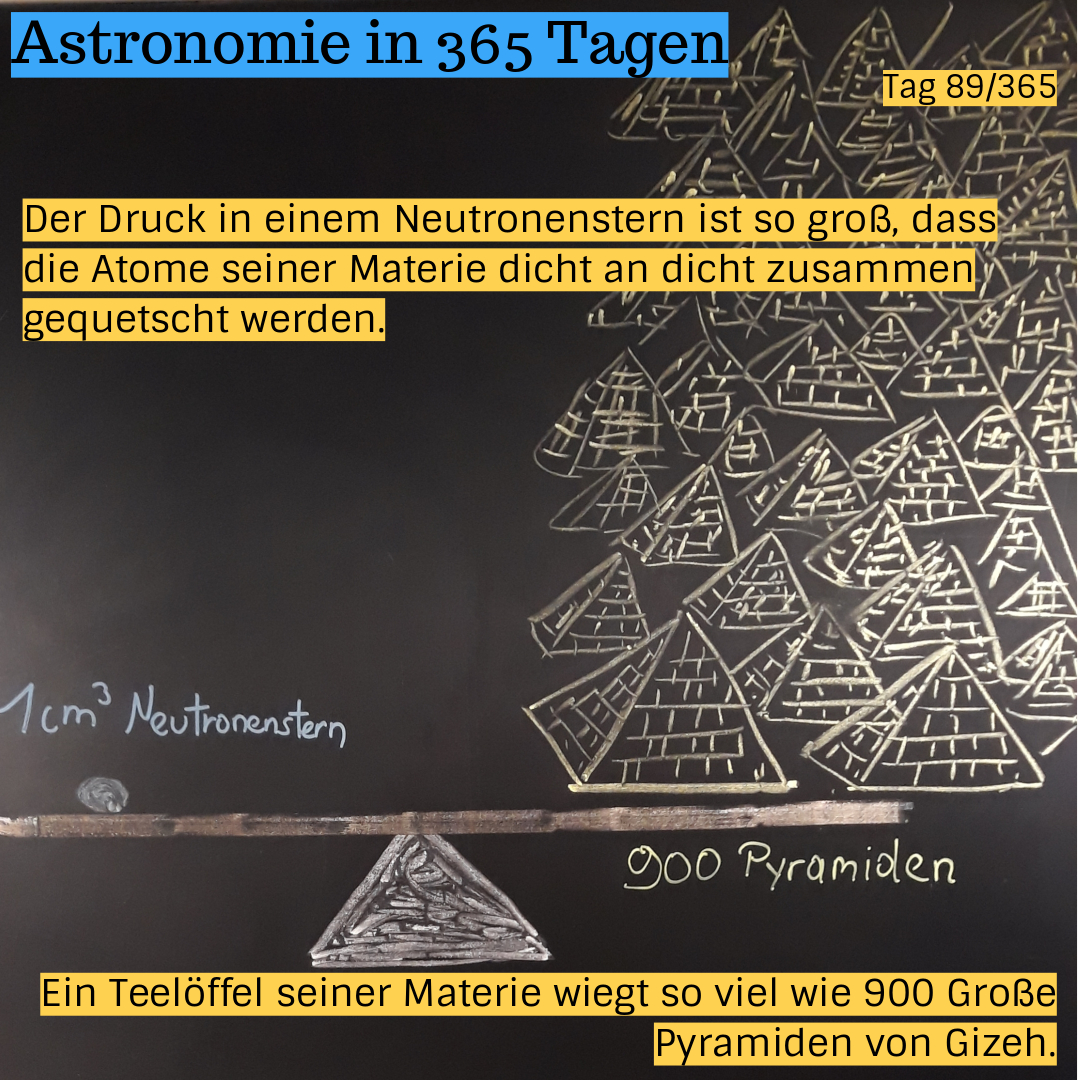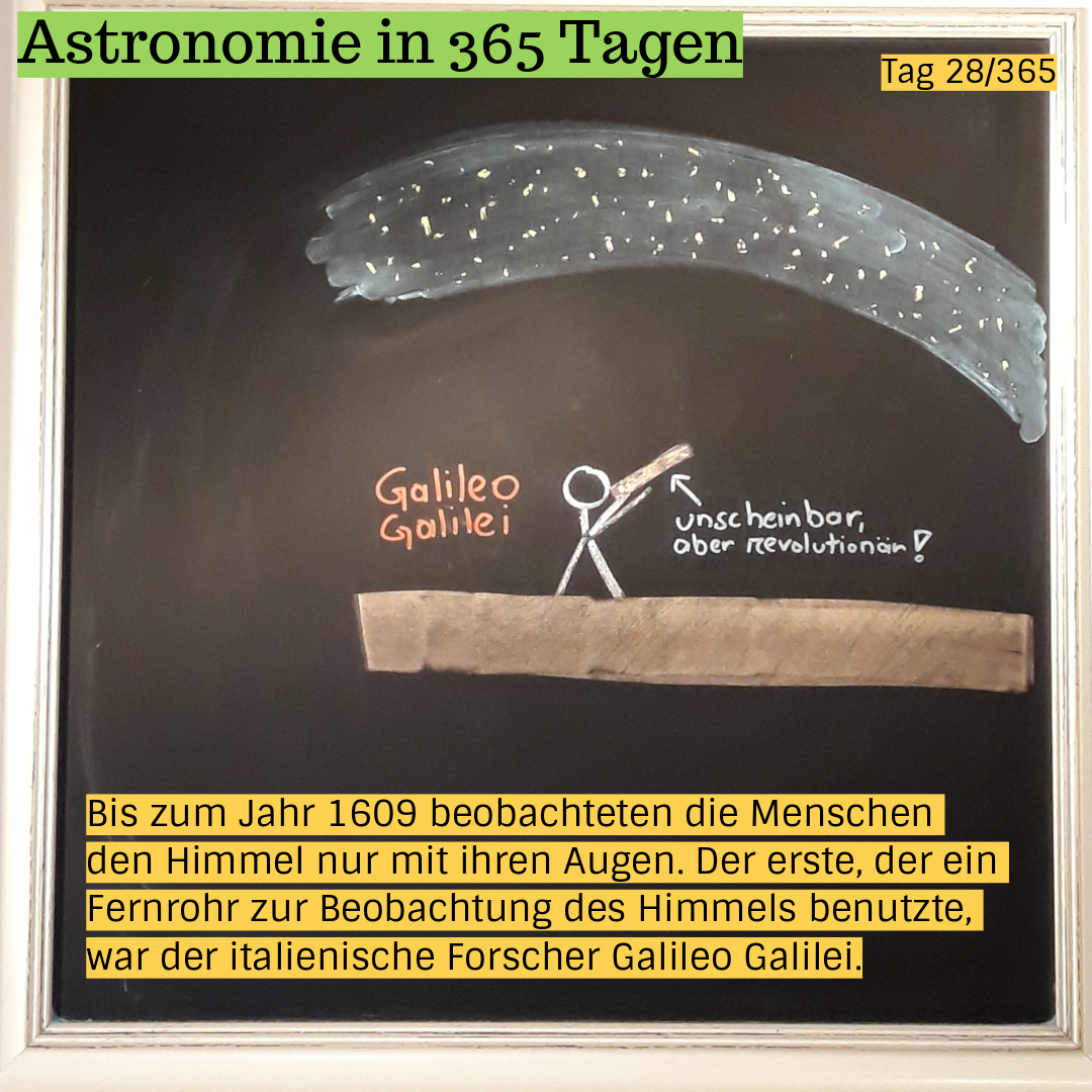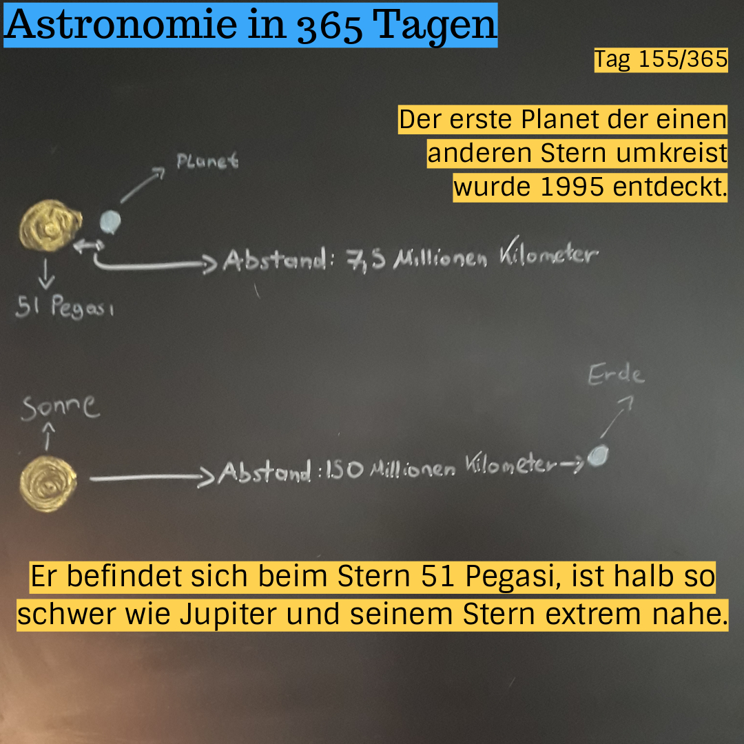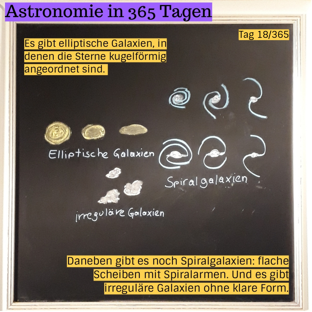 Also habe ich mich entschieden meinen Instagram-Account nicht mehr nur wie bisher dazu zu nutzen, ziemlich wahllose Sammlungen an Fotos meiner diversen Reisen, Auftritte und anderer Aktivitäten zu posten. Sondern ein echtes Konzept zu entwickeln wie man dort Wissenschaft vermitteln kann. Was mich vor ein kleines Problem gestellt hat: Instagram ist ein Medium das fast nur visuell arbeitet. Bilder sind alles und Text spielt kaum eine Rolle. Ich bin visuell aber eher unbegabt und es ist kein Zufall, dass sich meine Arbeit bis dahin so gut wie nur auf Texte (bzw. gesprochenen Text in meinen Podcasts) beschränkt hat. Ich bin nicht gut darin zu fotografieren und zeichnen kann ich auch nicht. Zuerst dachte ich, ich sammle einfach ein paar interessante Fakten über die Astronomie und bebildere die dann mit frei verfügbaren Fotos und Diagrammen aus dem Internet. Aber das erschien mir dann irgendwie wenig originell. Und an meiner Wand hing schon seit langem eine nette Kreidetafel mit der ich bis jetzt nicht viel anzufangen wusste. Wenn schon malen, dann mit Kreide auf einer Tafel, hab ich mir gedacht. Denn das ist vermutlich von allem Möglichkeiten diejenige, bei der mein fehlendes zeichnerisches Talent am wenigsten auffällt. Und außerdem kann ich die Bilder ja nachträglich noch mit ein wenig grafischem Text „verbessern“.