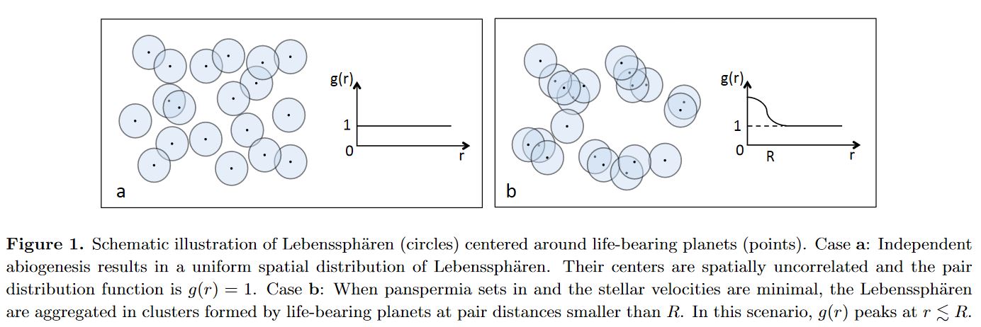Das Diagramm zeigt eine Verteilung von Planeten auf denen Leben existiert mit ihren jeweiligen Lebenssphären. Links sieht man, wie es aussehen würde, wenn das Leben auf jedem Planeten unabhängig entsteht. Rechts die Verteilung von „belebten“ Planeten im Fall von stattfindender Panspermie. Die mathematische Funktion g(r) neben der Verteilung ist ein Maß dafür, wie die Zentren der Lebenssphären verteilt sind bzw. zusammenhängen. Die Details sind jetzt nicht so wichtig, aber man sieht deutlich einen Unterschied (der sich eben auch mathematisch exakt ausdrücken lässt).