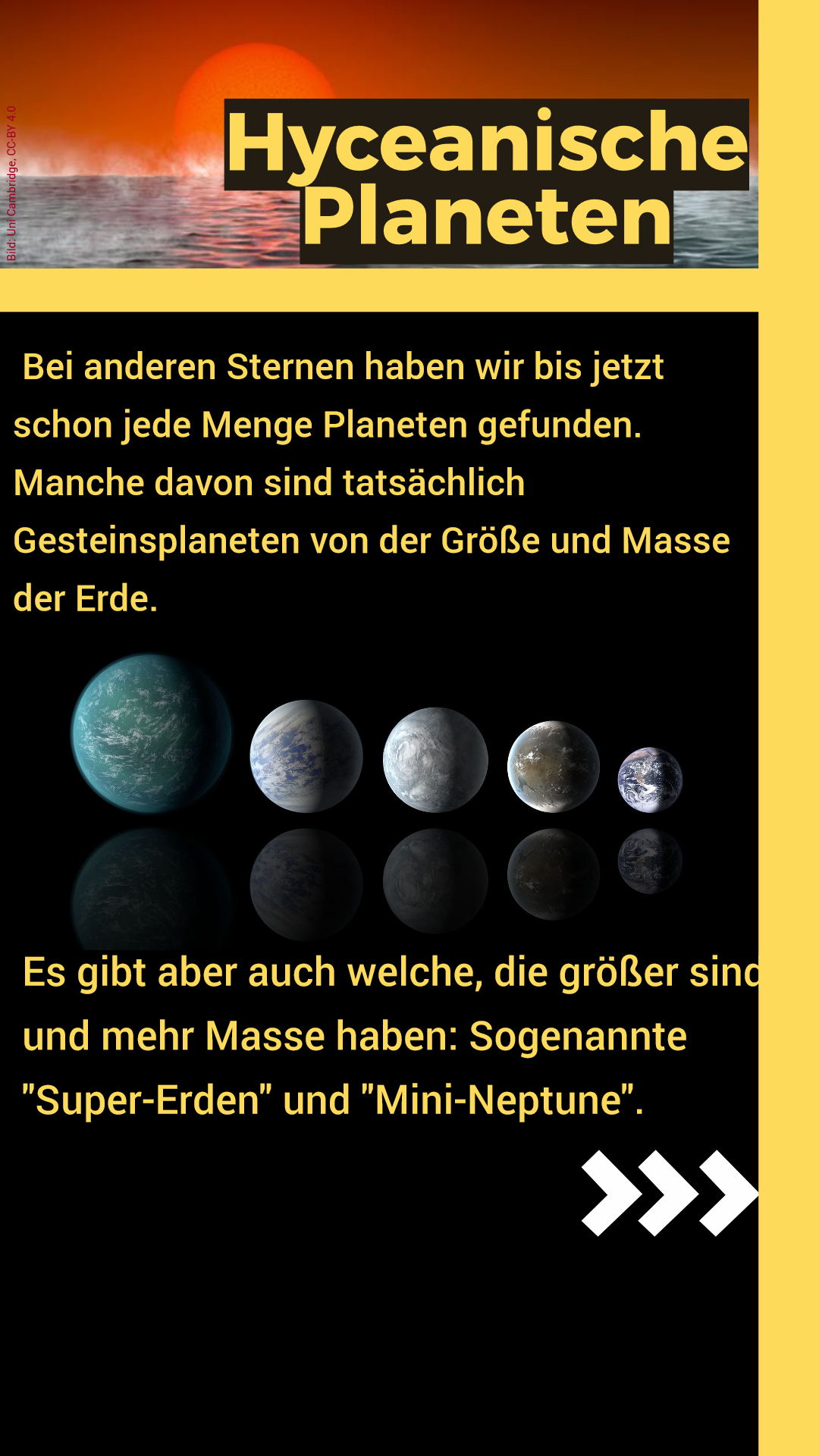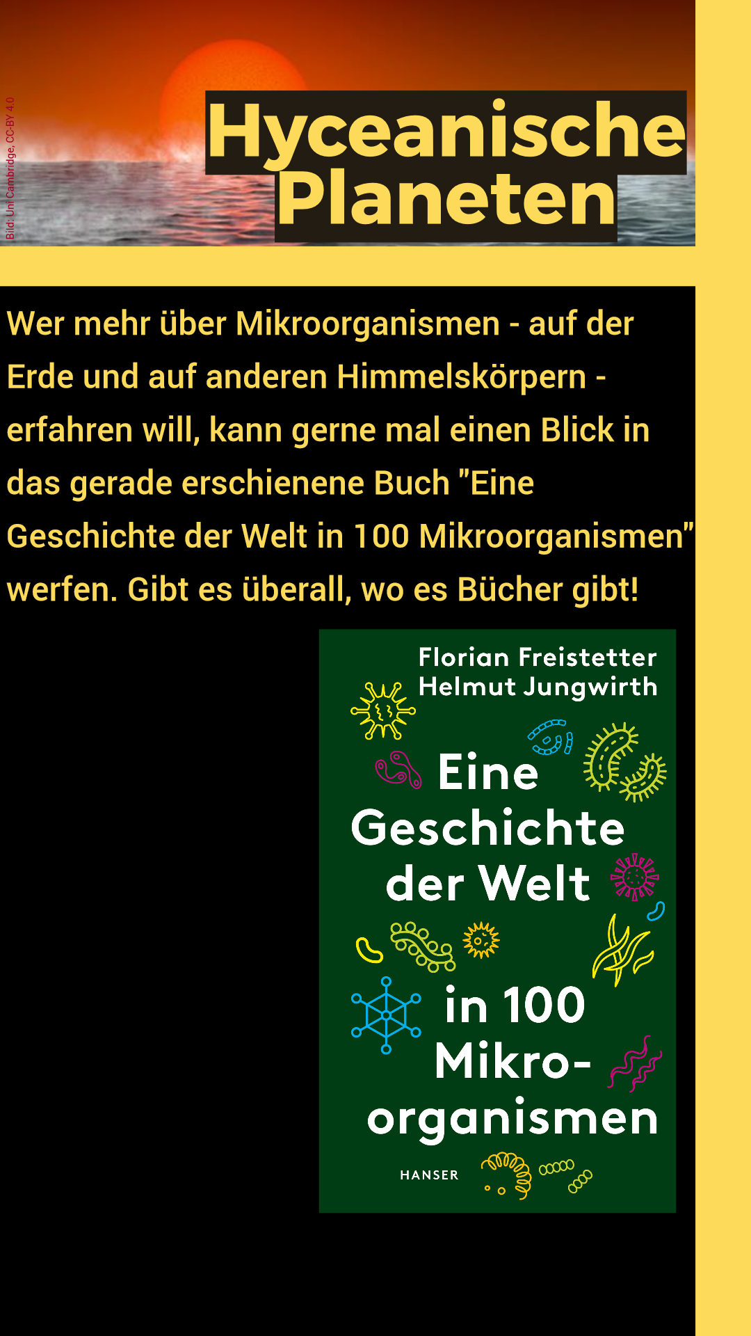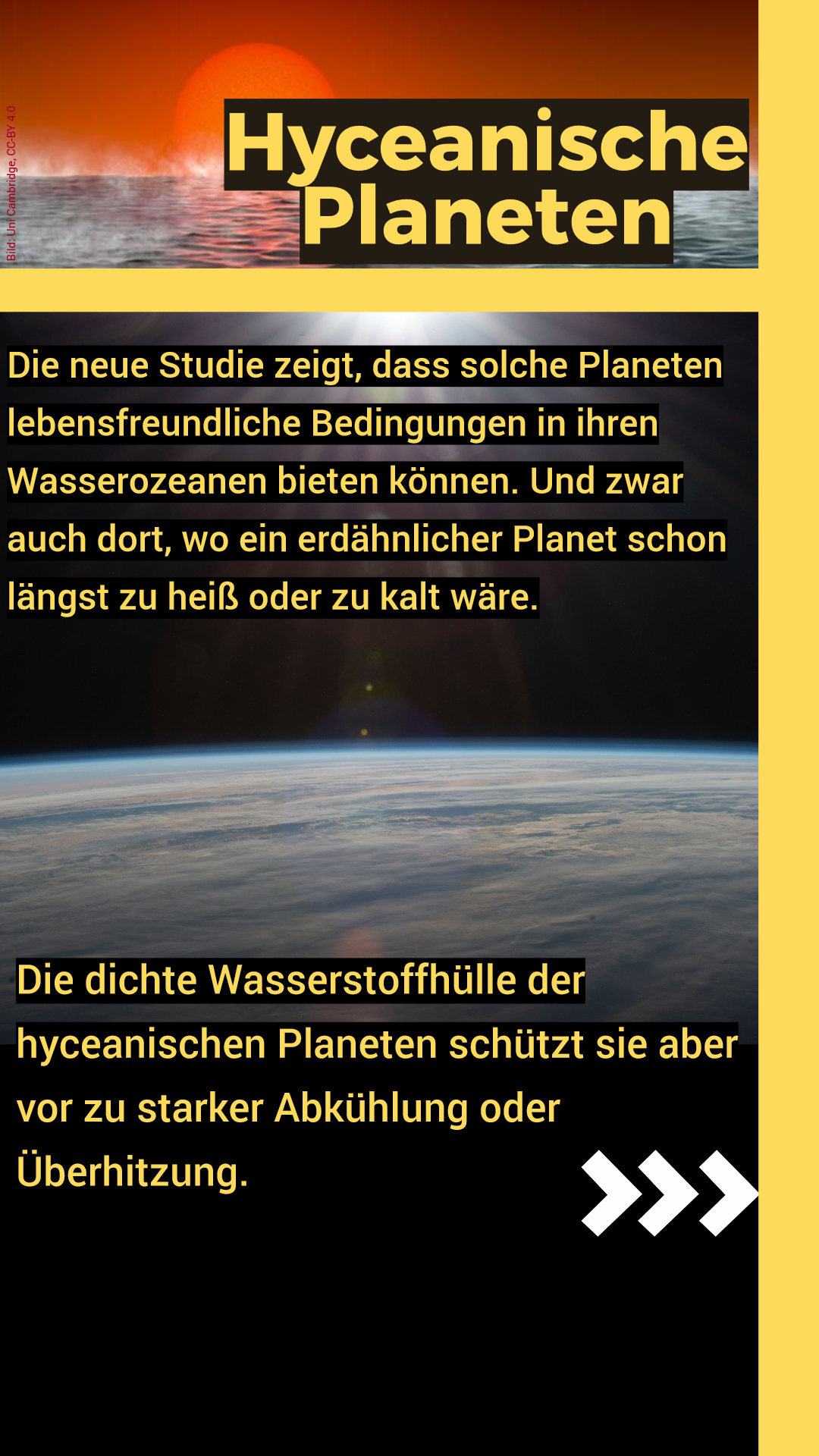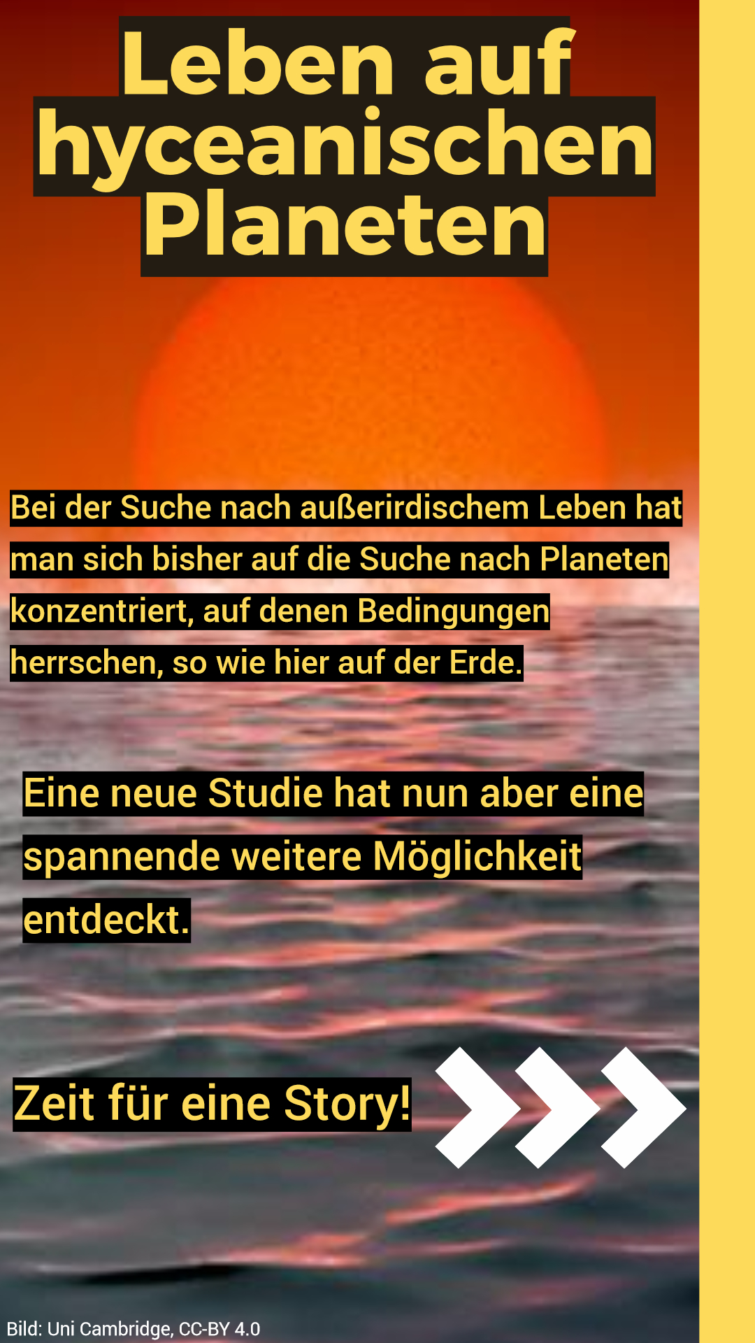 Ein Problem bei solchen Hyceanischen Planeten ist z.B., dass der Ozean so riesig ist. Das macht die Entstehung von Leben schwer, da die Ausgangsstoffe sehr stark verdünnt werden.