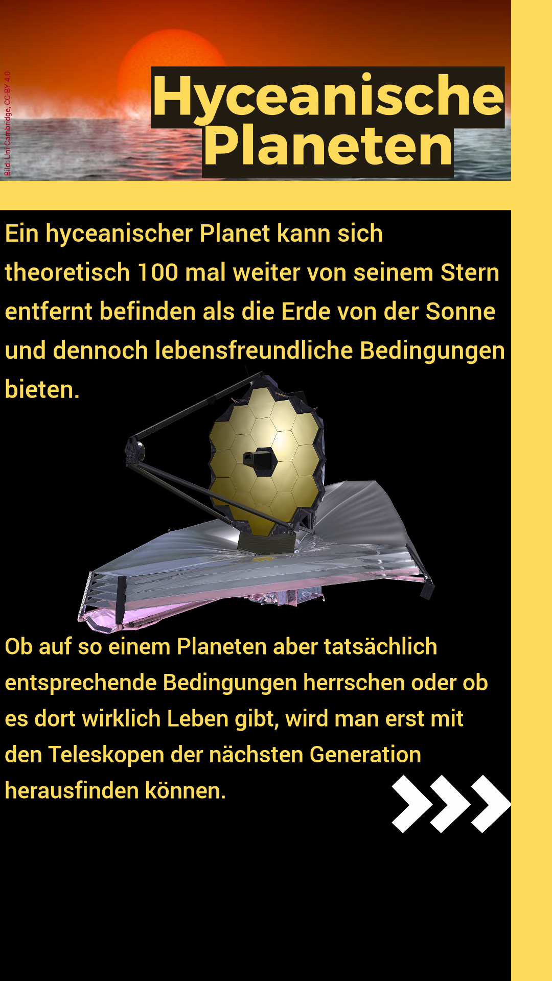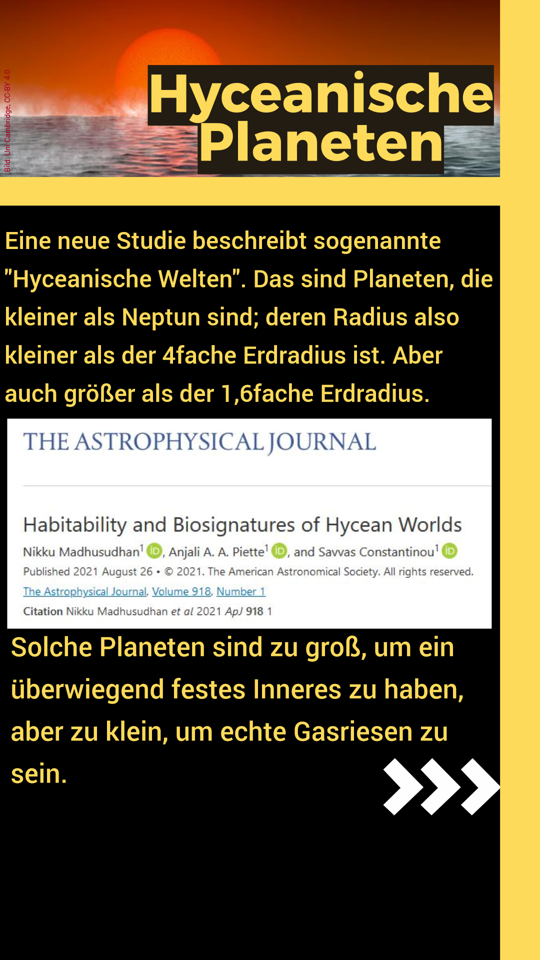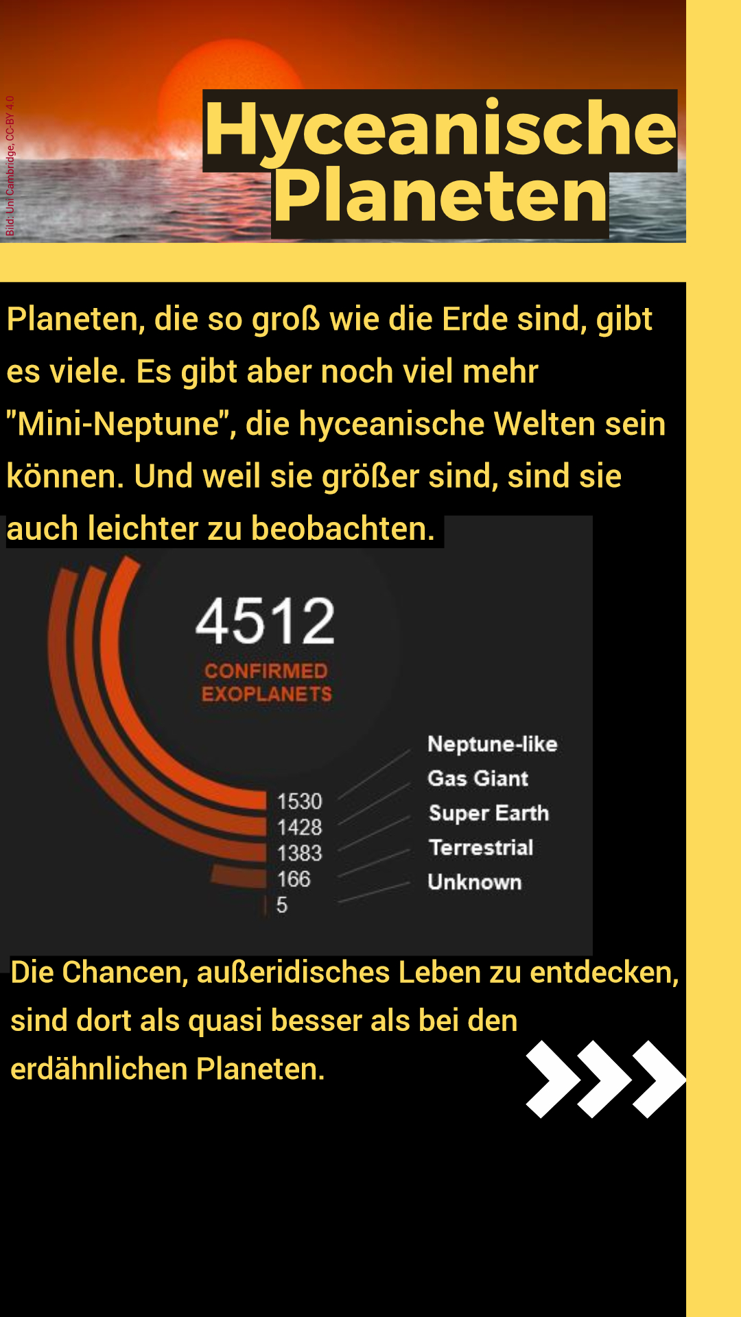Ein Problem bei solchen Hyceanischen Planeten ist z.B., dass der Ozean so riesig ist. Das macht die Entstehung von Leben schwer, da die Ausgangsstoffe sehr stark verdünnt werden.