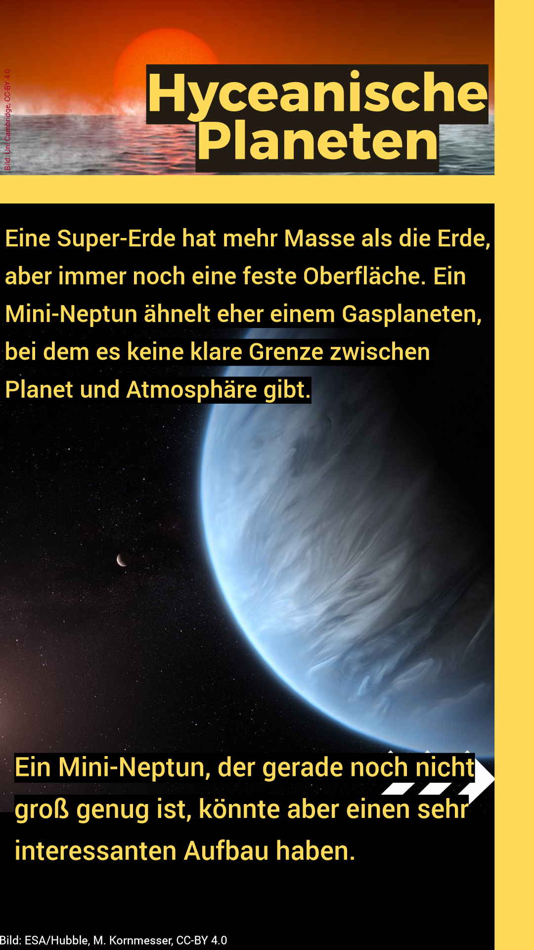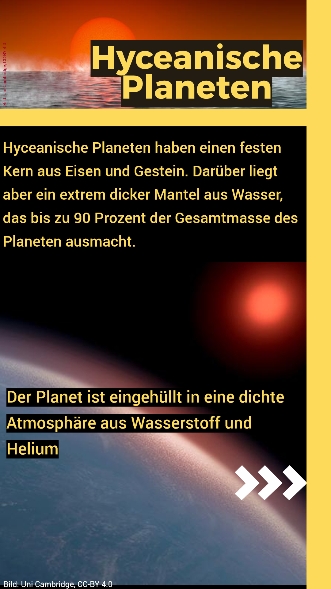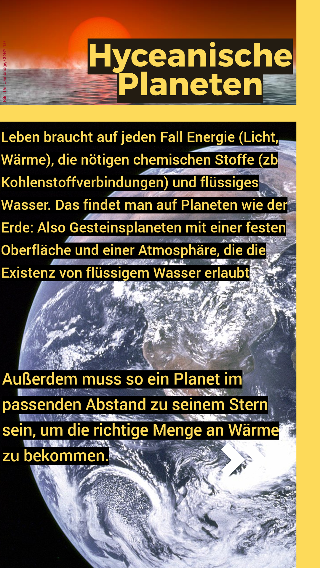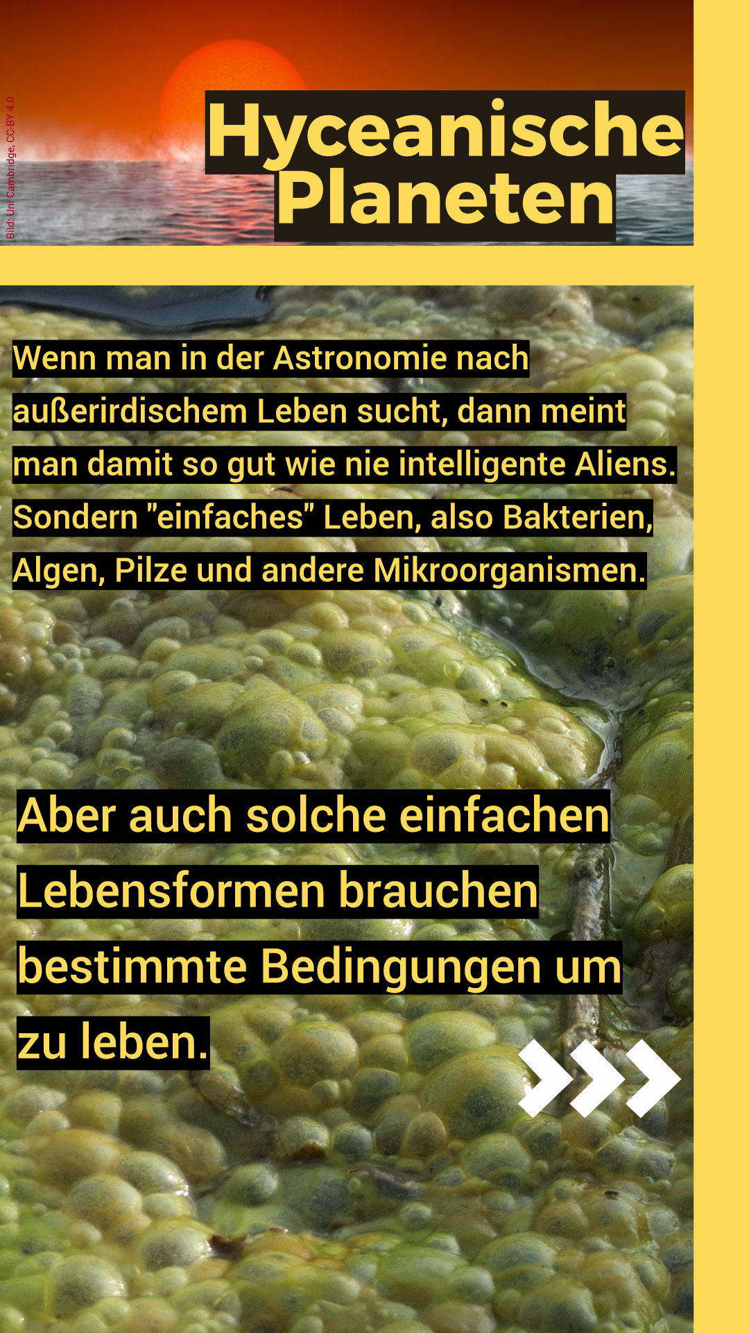 Ein Problem bei solchen Hyceanischen Planeten ist z.B., dass der Ozean so riesig ist. Das macht die Entstehung von Leben schwer, da die Ausgangsstoffe sehr stark verdünnt werden.