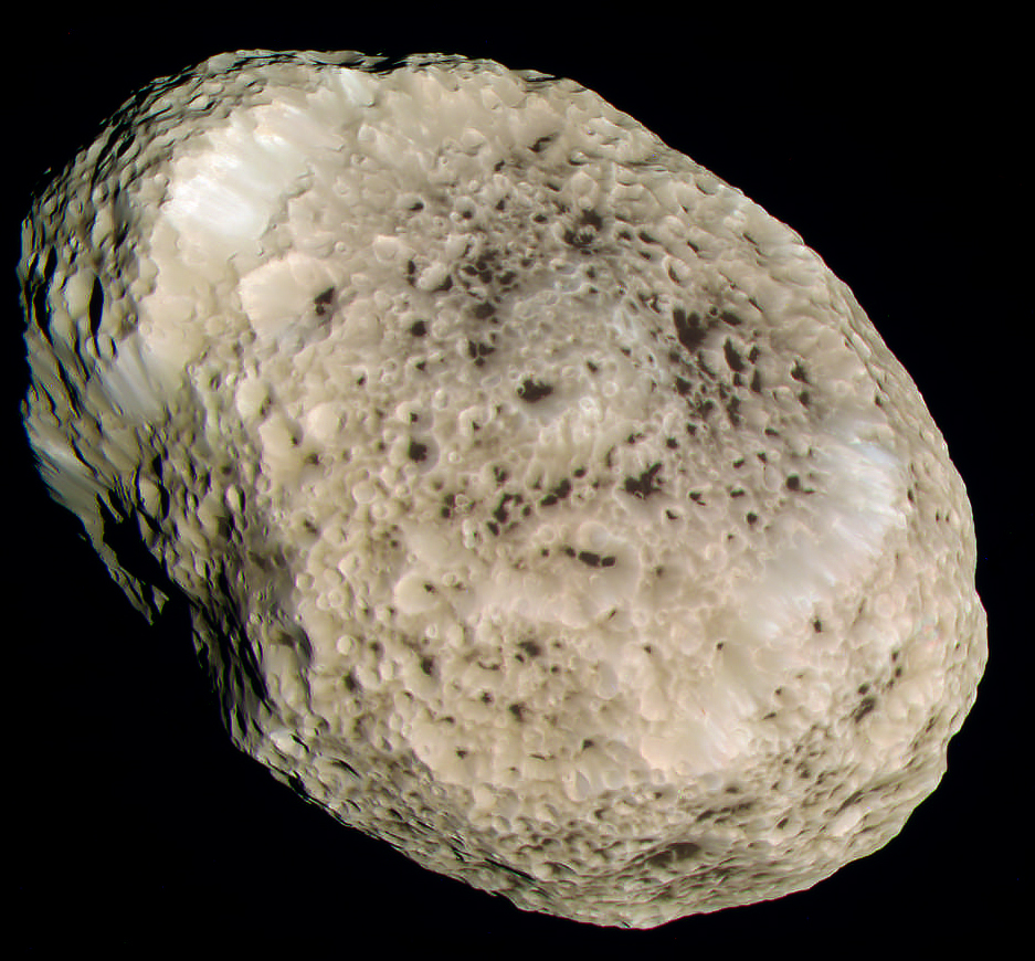 Das klingt absurd. Aber es gibt einen Himmelskörper im Sonnensystem, wo die Situation fast so ist. Der Saturnmond Hyperion ist ein ganz besonderes Objekt und den schauen wir uns in dieser Folge an. Entdeckt wurde der Mond im September 1848 vom amerikanischen Astronomen William Cranch Bond und seinem Sohn George Phillips Bond und unabhängig davon auch vom britischen Astronom William Lassell. Lassell war auch der erste, der die Entdeckung veröffentlicht hat. Und der dem damals achten bekannten Mond des Saturn den Namen „Hyperion“ gegeben hat. In der griechischen Mythologie war Hyperion ein Titan, Sohn von Uranos, dem Himmel und Gaia, der Erde. Die Mythologie lassen wir jetzt aber beiseite, denn der reale Mond ist interessant genug. Es ist ein vergleichsweise großer Mond, aber ein Mond mit einer seltsamen Form, die später noch eine wichtige Rolle spielen wird. Man kann keinen Durchmesser von Hyperion angeben, denn dazu ist er zu wenig regelmäßig geformt Er sieht aus wie eine längliche Kartoffel; so wie man es von einem typischen Asteroid erwarten würde. Hyperion ist aber viel größer als ein Asteroid, er ist in der einen Richtung 360 Kilometer lang, und in den anderen beiden 266 Kilometer beziehungsweise 206 Kilometer. Sein Abstand von Saturn beträgt 1,46 Millionen Kilometer und für eine Runde um den Ringplaneten braucht Hyperion 21 Tage und knapp 7 Stunden.